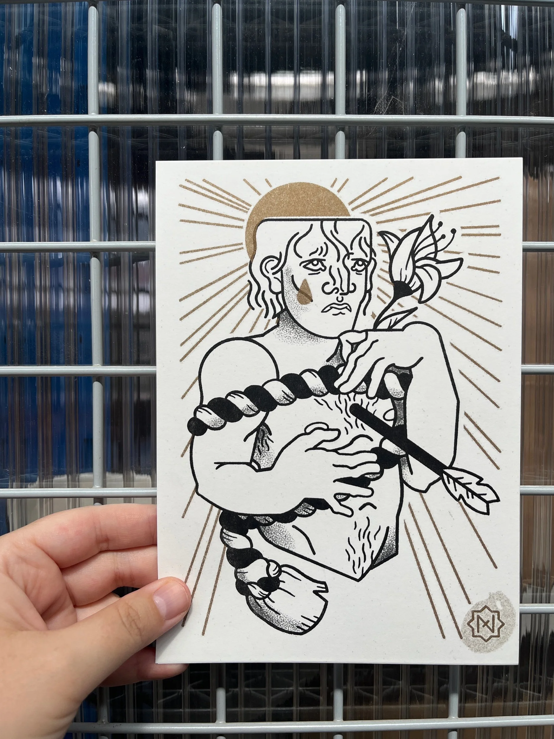 Shop › “Saint Sebastien” risographie Image 1 sur 3 Image 2 sur 3 Image 3 sur 3 “Saint Sebastien” risographie 10,00 € Risographie format A5, noir et doré. A5 size Risograph print, black and gold. Quantité: Ajouter au panier Ajout effectué ! Risographie format A5, noir et doré. A5 size Risograph print, black and gold.