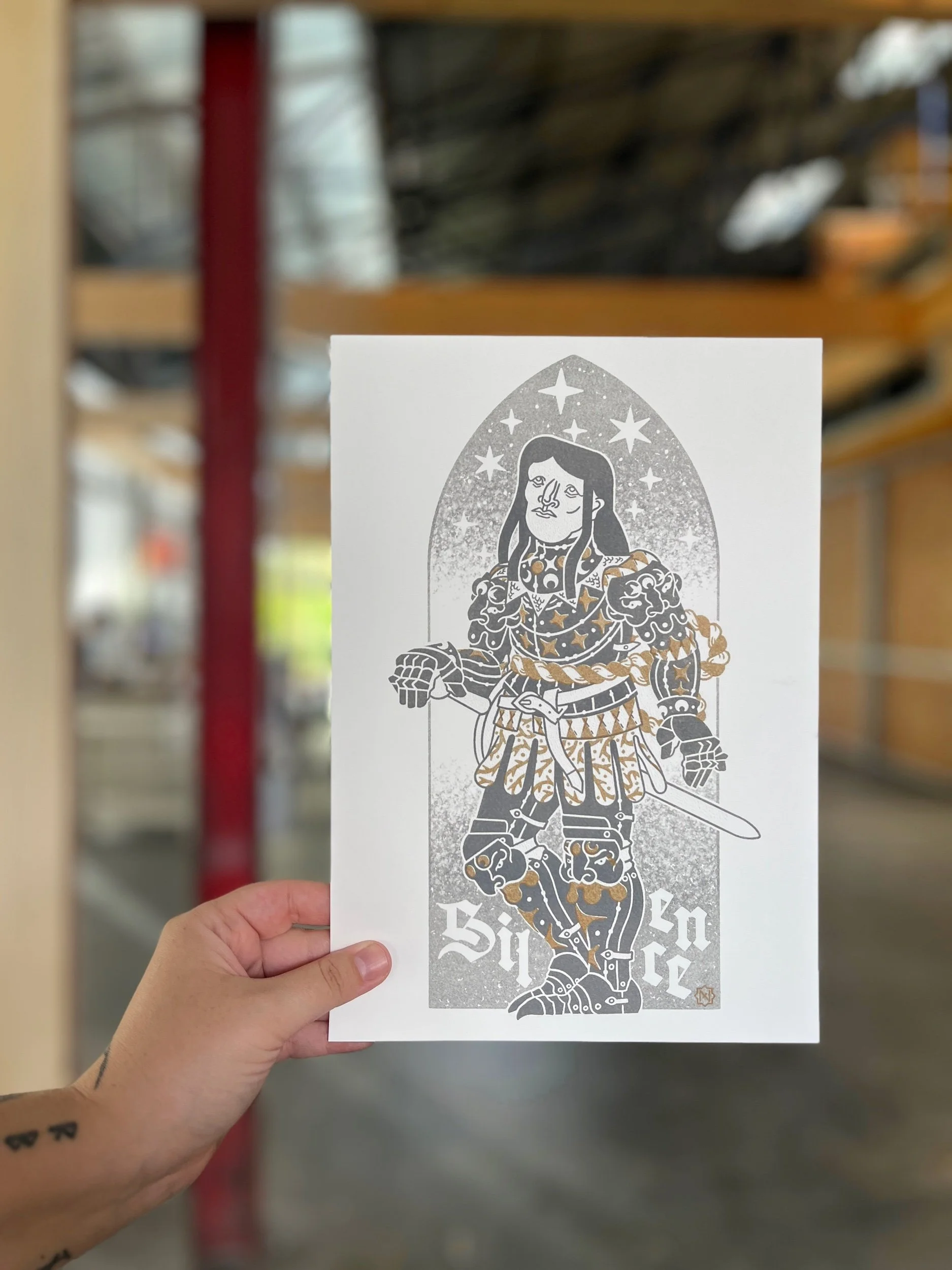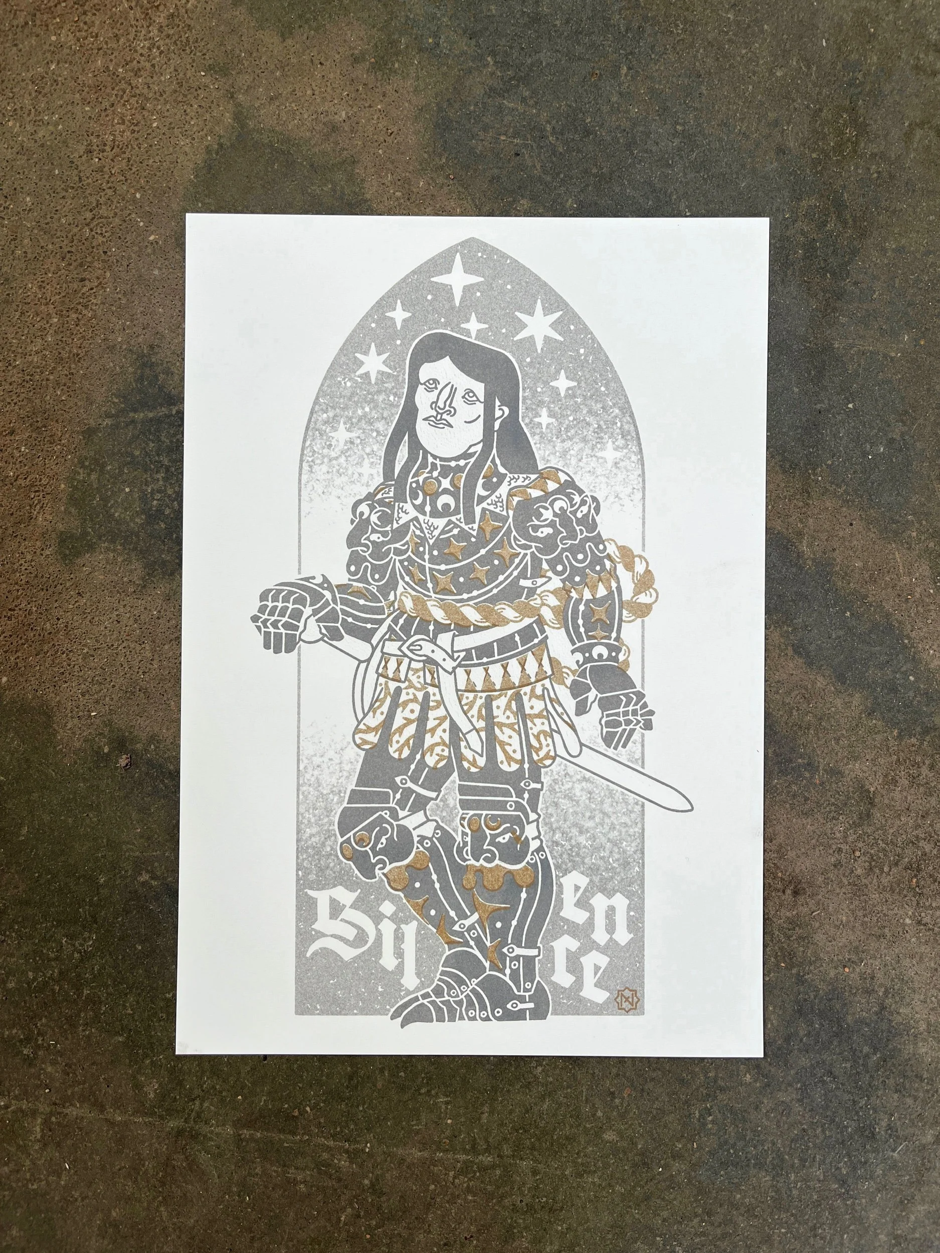 Shop › “Silence” risographie Image 1 sur 4 Image 2 sur 4 Image 3 sur 4 Image 4 sur 4 “Silence” risographie 20,00 € Risographie format A4, gris et doré. A4 size Risograph print, grey and gold. Quantité: Ajouter au panier Ajout effectué ! Risographie format A4, gris et doré. A4 size Risograph print, grey and gold.